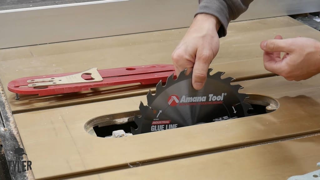 Once everything is flattened, you need to square up the last side over at the table saw. Because I was working with such thick hickory wood, I removed my combination blade and installed my ripping blade instead.