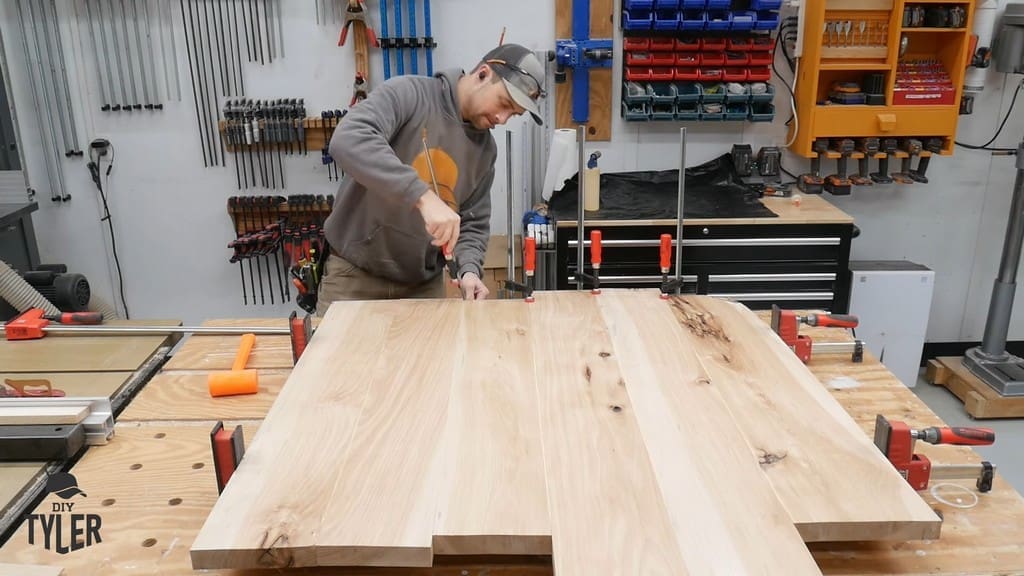 I made sure everything was perfectly flush by hand. Then, I added some clamps over each individual piece to make sure nothing would move.
