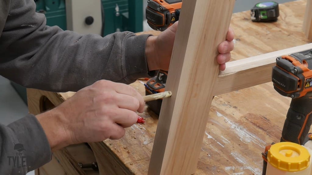 Each leg had two holes drilled into it: one for a full-length dowel, the other for a screw with a dowel plug on top.