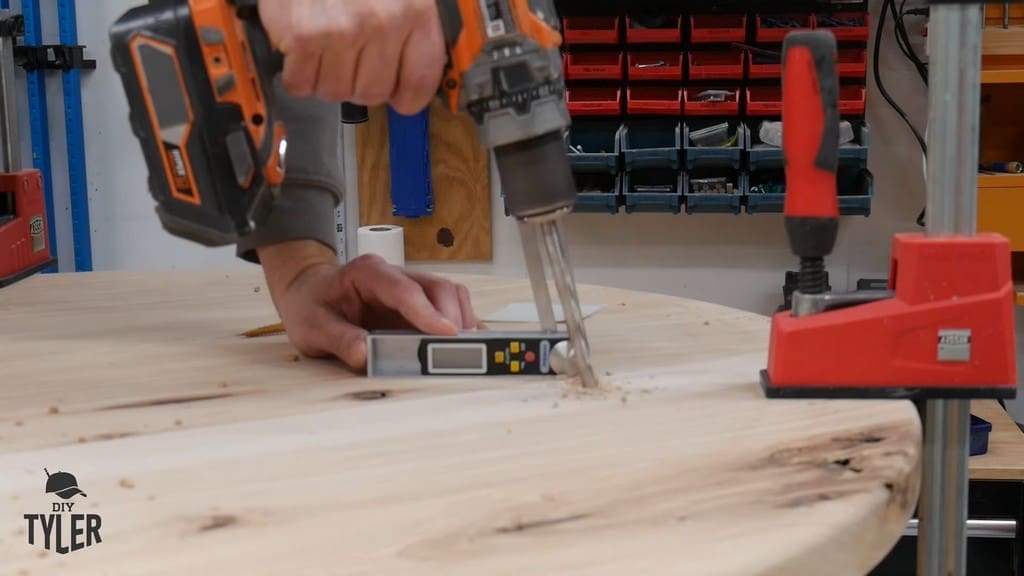 To make sure my holes for mounting the legs lined up, I decided to drill pilot holes from the bottom of the round slab through to the top. This way, I could know exactly where the dowel holes were going to be.