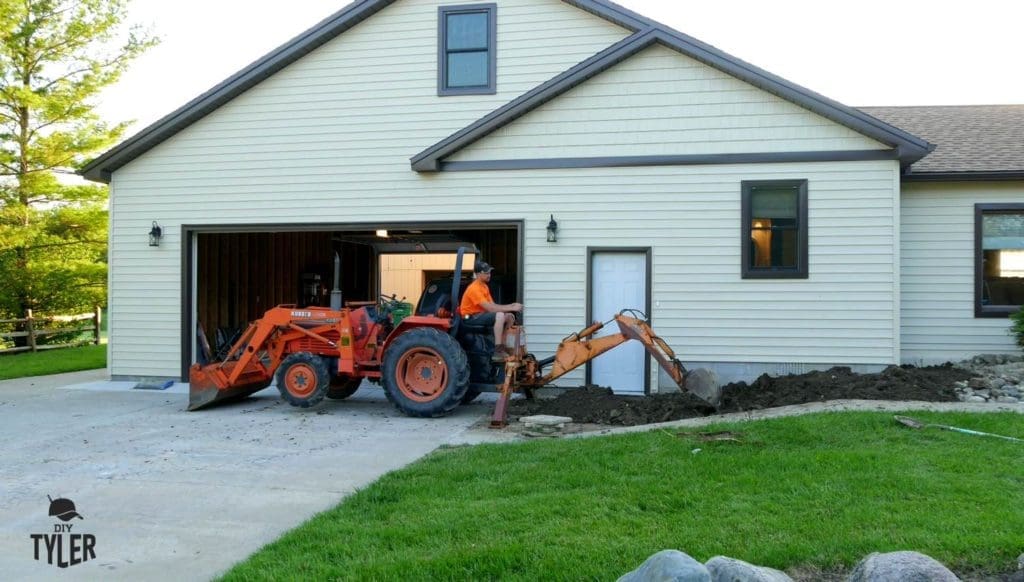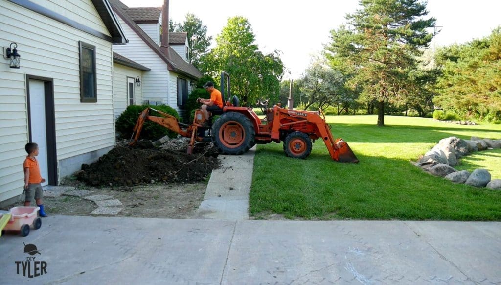 First order of business today will be calling around for a tractor. There’s no way I’m doing this by hand! My Dad graced me with use of his Kubota, and I started out by digging a trench from the corner of the house to the sidewalk, locating the underground drainpipe for our Gutters.
