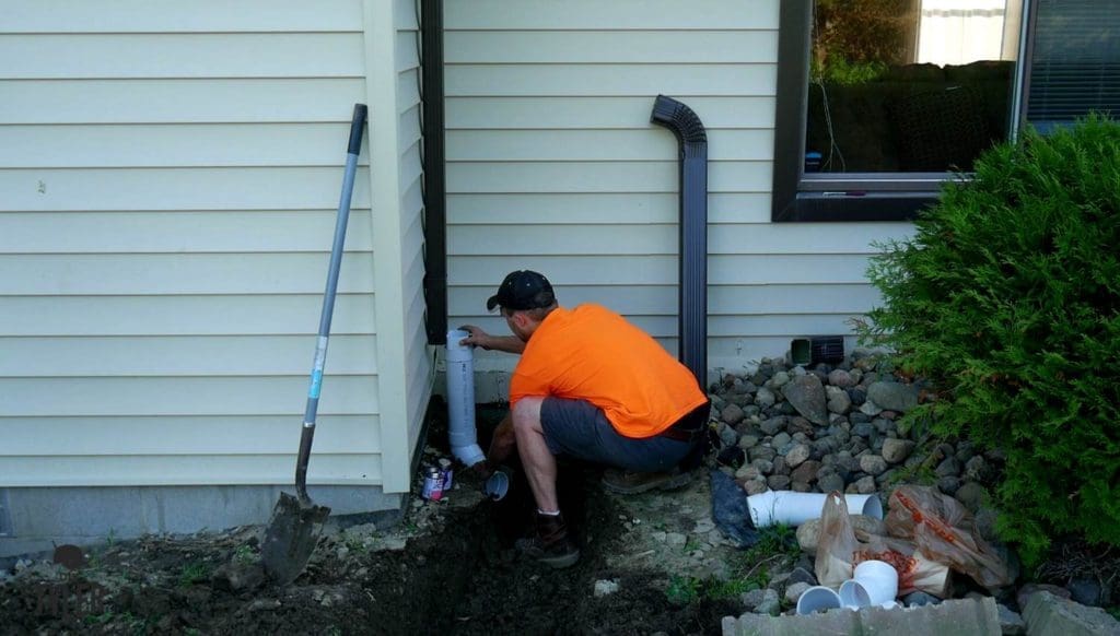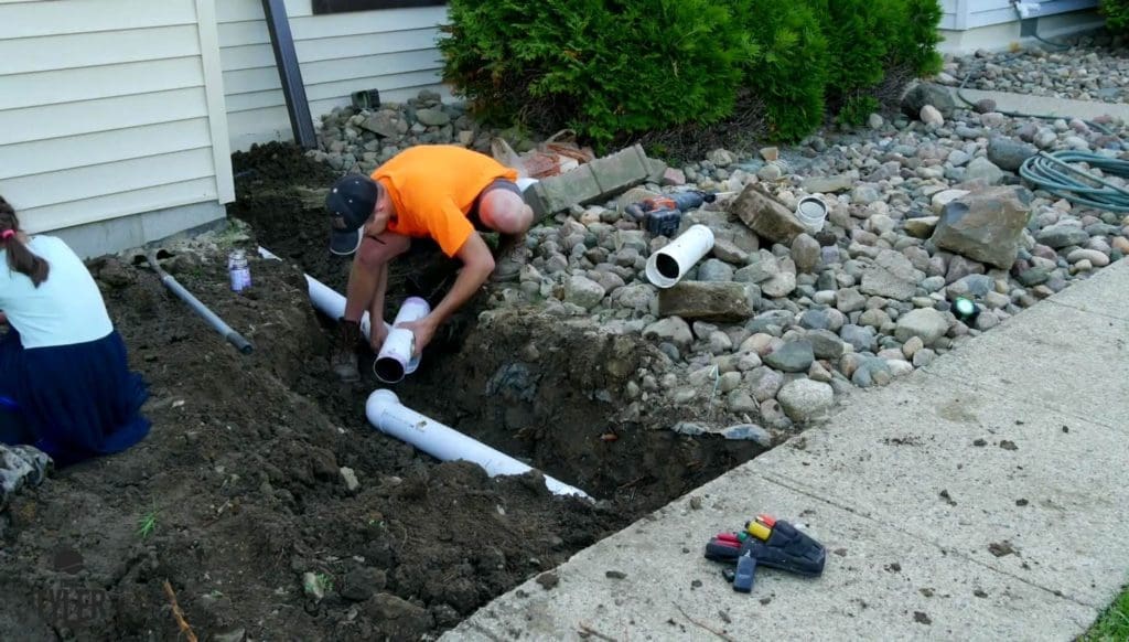 I then made the attachment using sewer and drainpipe from the big box stores, and sloped the gutter runoff appropriately away from the house. We first back-filled it in by hand, and then with the tractor, and went right to clearing away dirt for the Paver area.