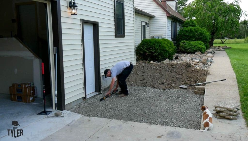 Then, Since this has already been back-filled in with 21AA base initially, we only need to put down 2-4 inches of 21AA today. This is the part of the project where sloping and drainage is key, because the final result of your pavers will rest on however this step is laid out.