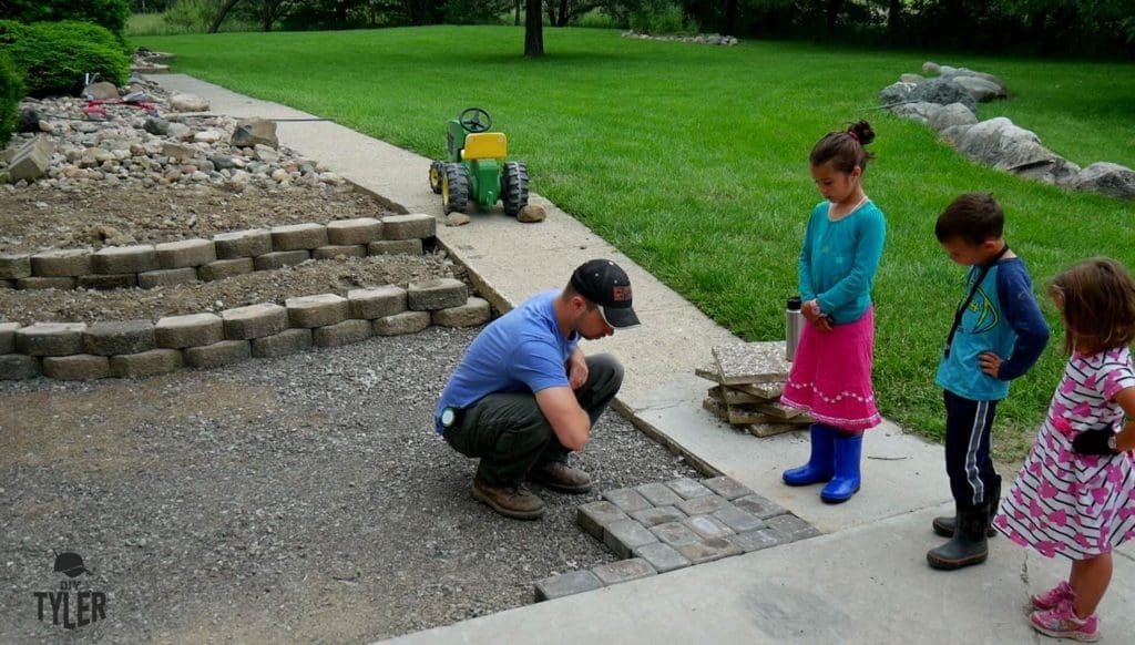 My kids were very helpful with this project and pitched right in, getting the pavers off the trailer and stacking them within my reach as fast as I could lay them. All 400 or so that we needed! Notice my son’s tractor in the background, and how he put Rocks behind his tires so it wouldn’t roll away. They notice everything, don’t they?