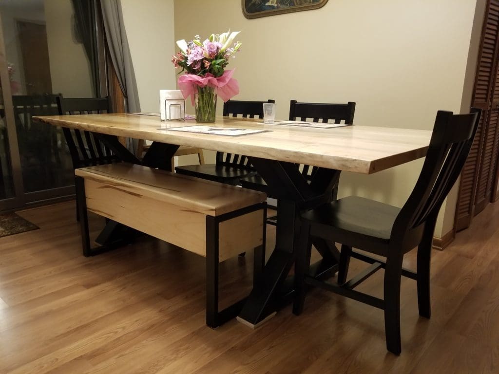 This week we finally added a matching maple bench to our kitchen dining set. This bench is made from solid maple and custom made minimal metal 1×2 tubing legs.